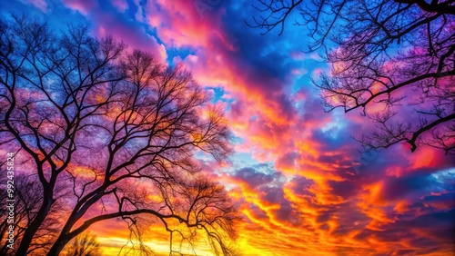 © Udomner, Obraz premium Vibrant sky with colorful hues casting over tree branches, abstract, colorful, sky, tree branches, nature, vibrant