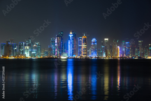 © Hladchenko Viktor, Fototapeta premium Vibrant Skyline of Doha at Night as seen from the opposite side of the capital city bay at night