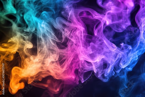 © Qohhar, Fototapeta premium Vibrant smoke swirls in hues of blue, pink, orange, and yellow against a black background. Intricate patterns of smoky clouds