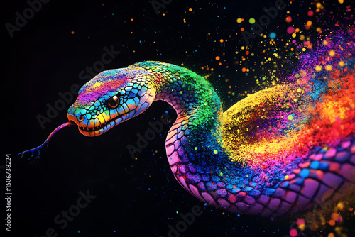 Fototapeta premium Vibrant snake emerging from colorful splashes, showcasing artistic expression and creativity