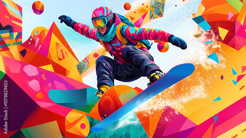 © Thiago, Obraz premium Vibrant snowboarding adventure: geometric shapes take the ride. Kaleidoscope. Illustration