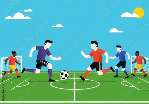 Fototapeta premium Vibrant soccer match: animated players on green field with blue sky and sun