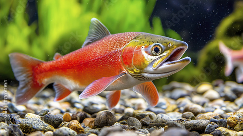 © Chineewan Somsap, Fototapeta premium vibrant sockeye salmon swimming gracefully among pebbles and aquatic plants. Its striking colors and lively movement create captivating underwater