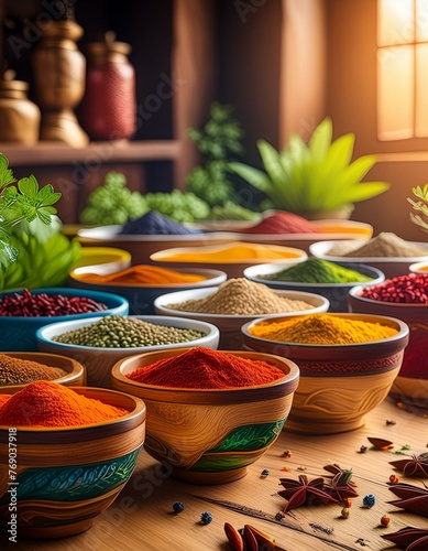 © Only 4K Ultra HD, Fototapeta premium Vibrant Spice Collection: Colorful Bowls on Wooden Table in Garden Setting