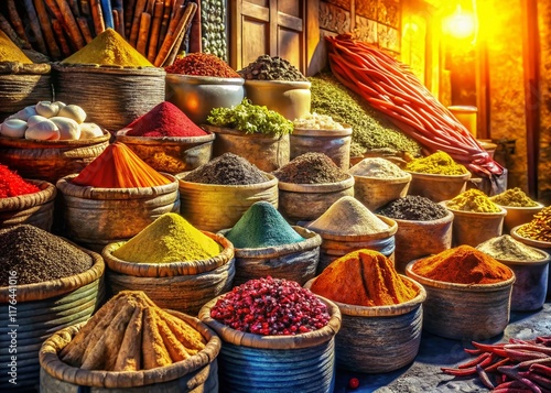 © Danicha, Fototapeta premium Vibrant Spice Market Architecture: Colorful Building Facades & Aromatic Spices