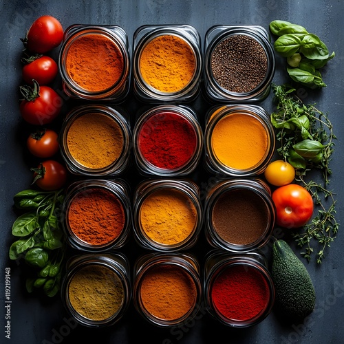 © Bos Amico, Naklejka premium Vibrant Spice Pantry with Fresh Herbs and Aromatic Dried Ingredients