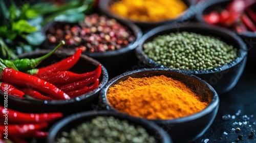 Fototapeta premium Vibrant Spices and Herbs in Rustic Bowls