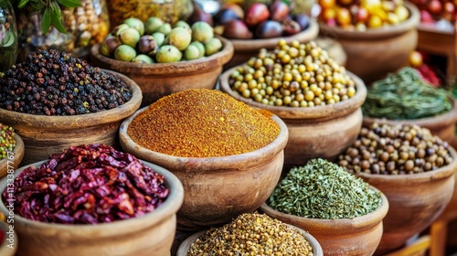 © Juan, Fototapeta premium Vibrant spices and herbs in rustic wooden bowls at a market