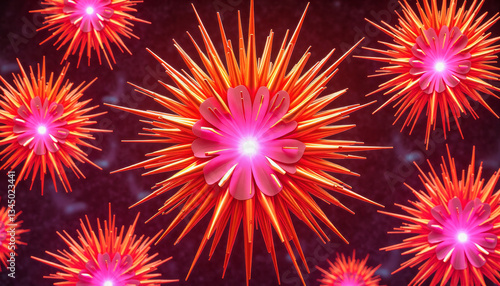 Fototapeta premium Vibrant, spiky orbs radiate outward against a deep red and purple background,...