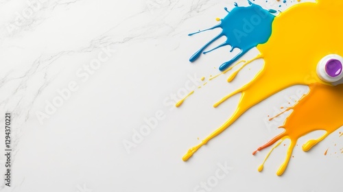 Fototapeta premium Vibrant splashes of paint in blue, yellow, and orange on a white marble surface, showcasing creativity