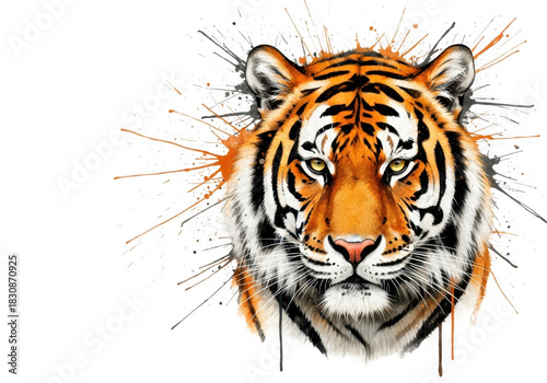 © SAIKAT, Naklejka premium Vibrant splatter art tiger portrait on black background