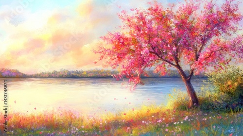 © musthofa, Fototapeta premium Vibrant spring blossoms over a serene lake landscape.