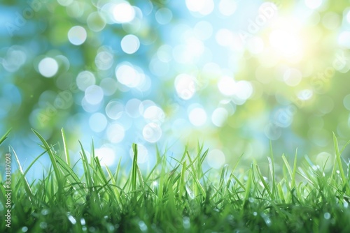 Fototapeta premium Vibrant spring field with lush green grass and clear blue sky. Artistic backdrop featuring soft focus and room for words