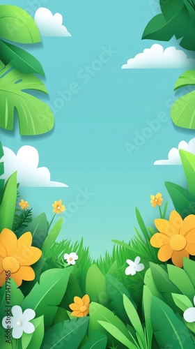 Obraz premium Vibrant Spring Floral Border with Tropical Leaves and Blue Sky Background