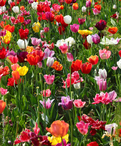 Fototapeta premium vibrant spring flowerbed of colorful Dutch tulips in full bloom