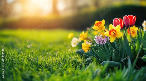 © Bagas, Fototapeta premium Vibrant spring flowers in a garden at sunset.