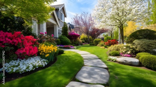 © Darko, Naklejka premium Vibrant Spring Garden in a Beautiful Residential Neighborhood