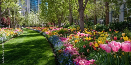 Fototapeta premium Vibrant Spring Garden in Urban Park with Blossom Trees and Greenery