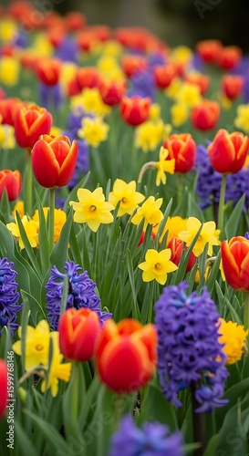 © MissBeauty, Fototapeta premium Vibrant Spring Garden: Red Tulips, Yellow Daffodils, Purple Hyacinths, Close-Up