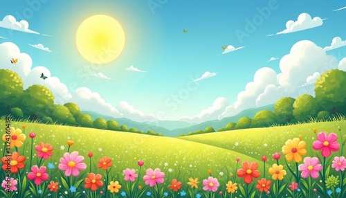 © miss irine, Fototapeta premium Vibrant spring landscape illustration with meadow flowers under bright sun. Green hills, trees, white clouds create cheerful rural scene. Summer scenery with blossoming flora, clear blue skies.