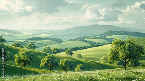 Fototapeta premium Vibrant spring landscape with rolling green hills under a bright sky full of...