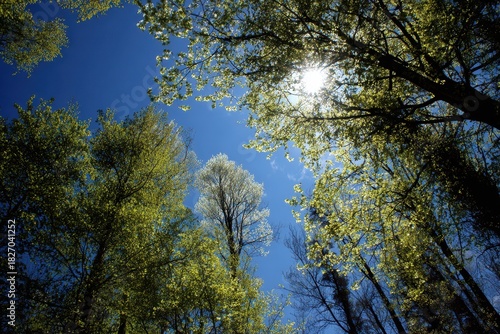 © Olena, Obraz premium Vibrant Spring Landscape: Young Green Trees Reaching for a Blue Sky with Sunlit Glimmers