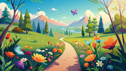 © jannatul, Fototapeta premium Vibrant spring meadow path leading to majestic mountains under a sunny sky