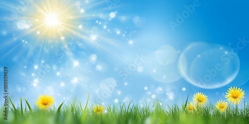 © Sazzad Hossain , Obraz premium Vibrant Spring Meadow Sunlit Dandelions in Lush Green Grass Under a Bright Blue Sky