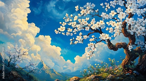 © Yuto, Fototapeta premium Vibrant Springtime Digital Painting: Blossoming Tree Under a Sunny Sky AI Generated