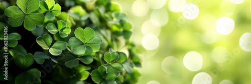 Fototapeta premium Vibrant St. Patrick's day celebration with lush green clovers. Irish traditional holiday. Horizontal banner. Copy space. Template for greeting card, poster, flyer, web, social media