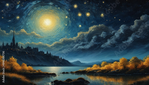 © ToriStudioArt.SVH, Obraz premium Vibrant Starry Sunset Over Mountain Lake Landscape Dreamy Twilight Stars