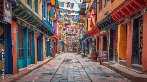 © BrilliantPixels, Fototapeta premium Vibrant street adorned with a multitude of flags suspended from building facades