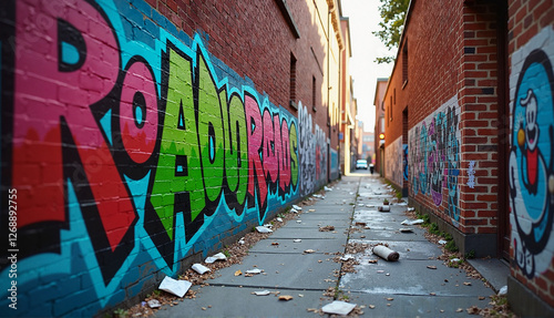 © Irina, Fototapeta premium Vibrant street art in urban alley with scattered trash during daytime