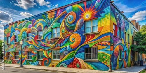 Naklejka premium Vibrant Street Art Mural with Swirling Patterns and Windows, Colorful, Abstract, Cityscape, Building, Mural Art, Street Art