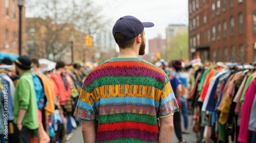 Fototapeta premium Vibrant Street Market Fashion with Man in Colorful Shirt