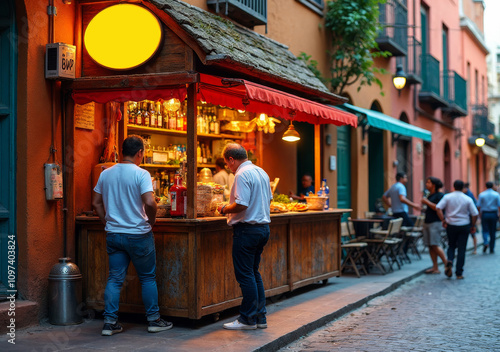 Naklejka premium Vibrant street market stall with people gathering in a lively urban setting