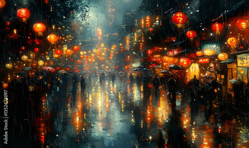 © Eka, Fototapeta premium Vibrant street scene at night with glowing lanterns and umbrellas in a rainy urban setting
