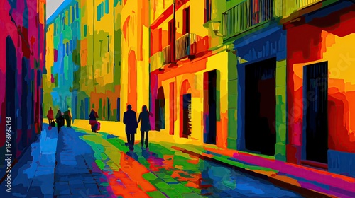 Fototapeta premium Vibrant street scene in abstract block color style.