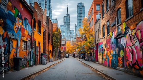 © Janis, Fototapeta premium Vibrant Street Scene Showcasing Colorful Murals and Urban Art Culture – Generative AI