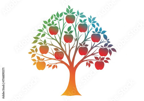 Obraz premium Vibrant stylized apple tree with colorful gradient fruits and leaves on a white background