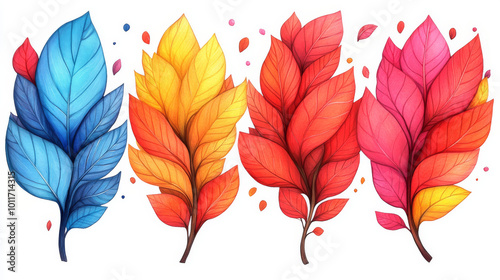 Fototapeta premium Vibrant, stylized leaves in blue, orange, red and pink.