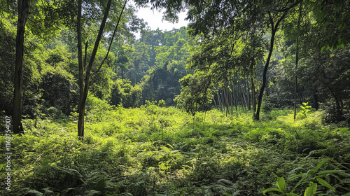 Obraz premium vibrant subtropical forest scene in Nepal, filled with lush greenery and...