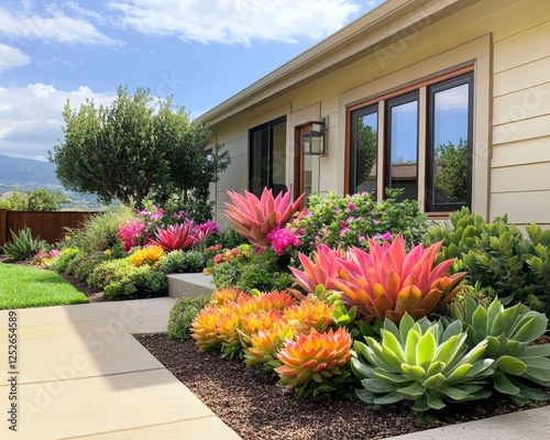 Fototapeta premium Vibrant Succulent and Flower Garden Landscape Design in Front of Modern House.