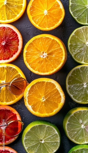 © Emvats, Fototapeta premium Vibrant summer composition with sunglasses and citrus fruits