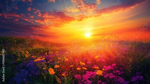 Fototapeta premium Vibrant summer fields illuminated by a stunning sunset, showcasing colorful wildflowers under a dramatic sky filled with hues of orange and purple.