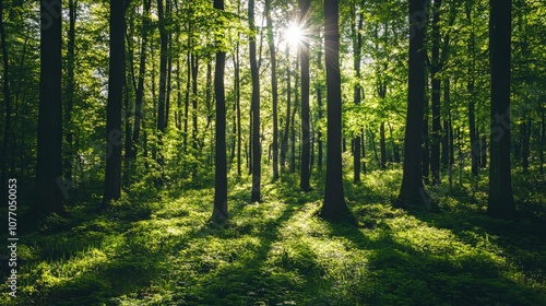 © Monchisa, Naklejka premium Vibrant Summer Forest Sunlight Dappled Shadows Rich Green Foliage