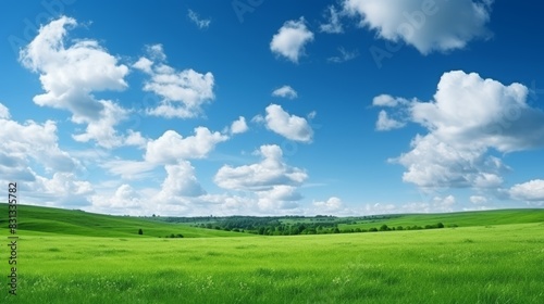 Fototapeta premium Vibrant summer landscape lush green field, blue sky, and fluffy clouds on...