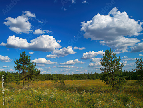 Obraz premium Vibrant summer landscape with a lush meadow under a bright blue sky dotted...