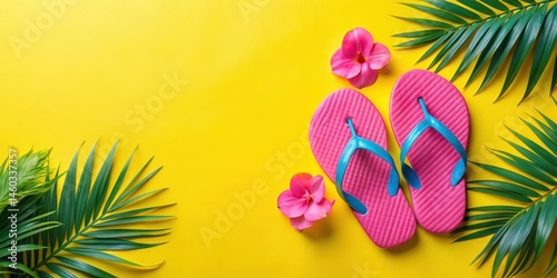 © Vibrant Visions Pixe, Naklejka premium Vibrant Summer Sandals, Tropical Leaves, and Delicate Pink Blossoms on a Sunny Yellow Background
