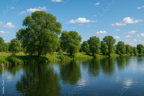 Fototapeta premium Vibrant summer view featuring flourishing trees beside a river